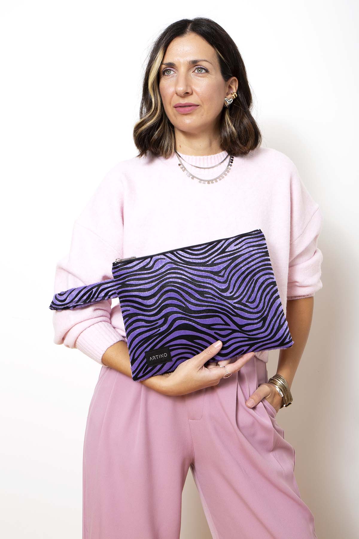 This is a handmade clutch made from one material. It has a zipper closer and a convenient wrist handle measuring 15 cm.