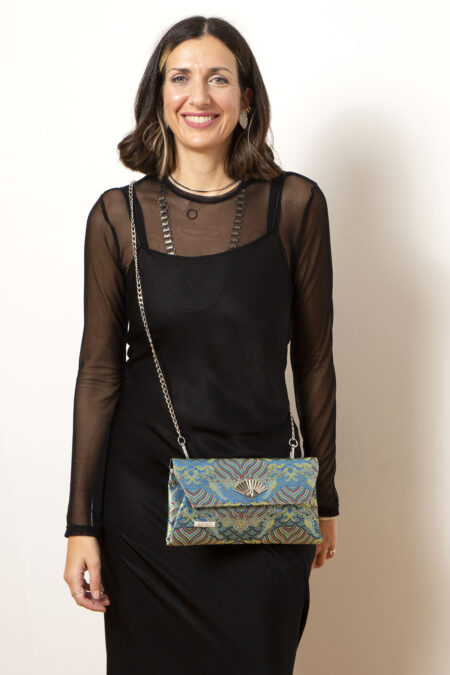 €74.00Size: L29 x H15 Materials: Silk fabric, black lining Color: Blue, red & light gold Care: Do not wash. Do not dry clean. Do not bleach. Do not tumble dry. In case of an emergency, spot wash only as follows. Apply a small amount of stain remover to any exterior or interior stains using a soft cleaning cloth. Allow it to sit for about 30 minutes. Gently scrub the bag, then rinse thoroughly and air-dry. Please be aware that bag patterns may vary due to textile design.